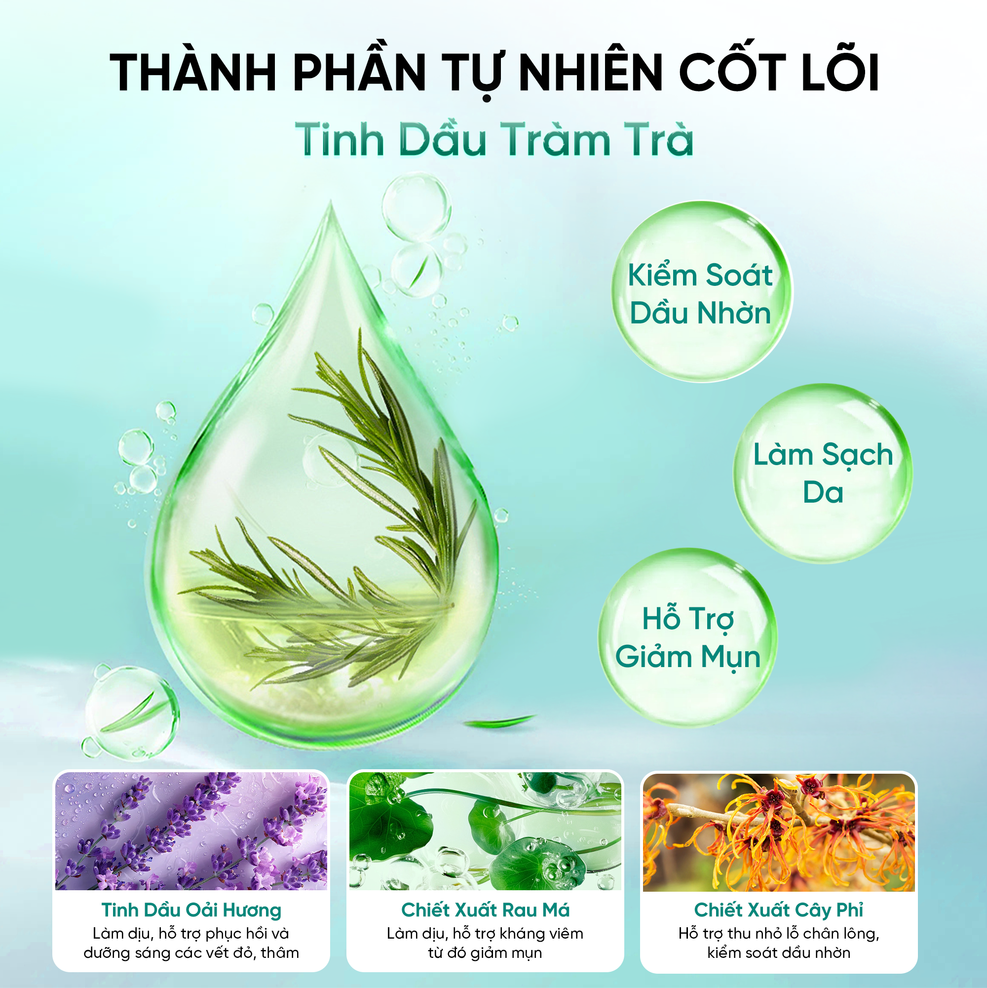 – Các chiết xuất thiên nhiên: Tinh dầu tràm trà, Tinh dầu oải hương, Chiết xuất rau má, Chiết xuất cây phỉ.